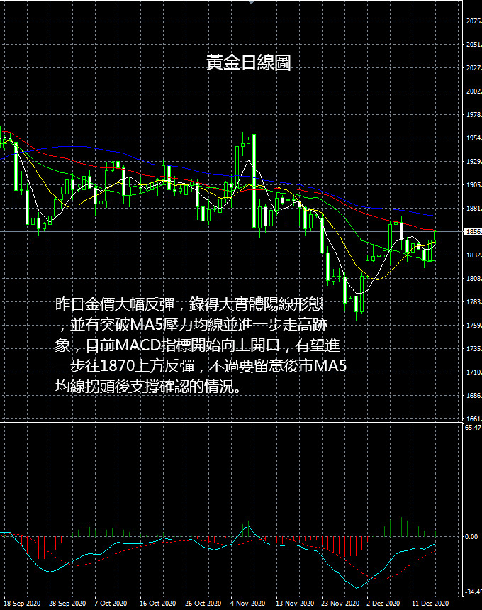 從現貨黃金日線圖看,昨日金價大幅反彈,錄得大實體陽線形態,並有突破MA5壓力均線並進一步走高跡象,目前MACD指標開始向上開口,有望進一步往1870上方反彈,不過要留意後市MA5均線拐頭後支撐確認的情況。