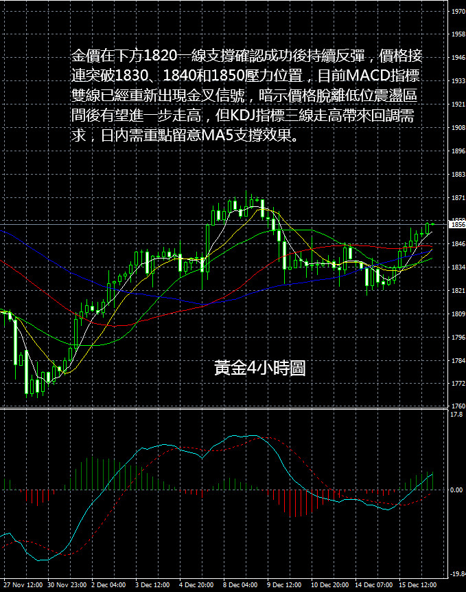 從現貨黃金4小時圖看,金價在下方1820一線支撐確認成功後持續反彈,價格接連突破1830、1840和1850壓力位置,目前MACD指標雙線已經重新出現金叉信號,暗示價格脫離低位震盪區間後有望進一步走高,但KDJ指標三線走高帶來回調需求,日內需重點留意MA5支撐效果。