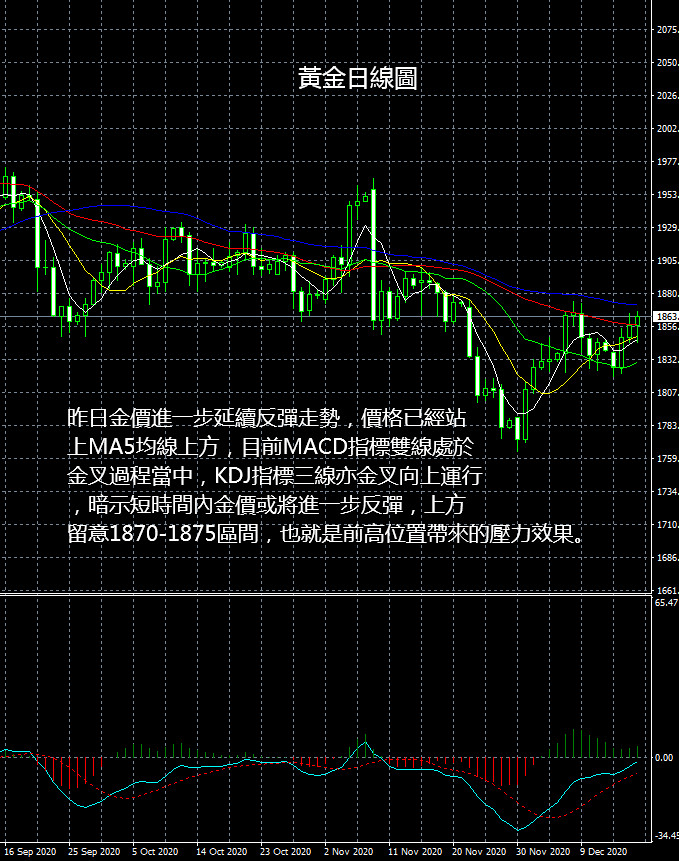 從現貨黃金日線圖看,昨日金價進一步延續反彈走勢,價格已經站上MA5均線上方,目前MACD指標雙線處於金叉過程當中,KDJ指標三線亦金叉向上運行,暗示短時間內金價或將進一步反彈,上方留意1870-1875區間,也就是前高位置帶來的壓力效果。