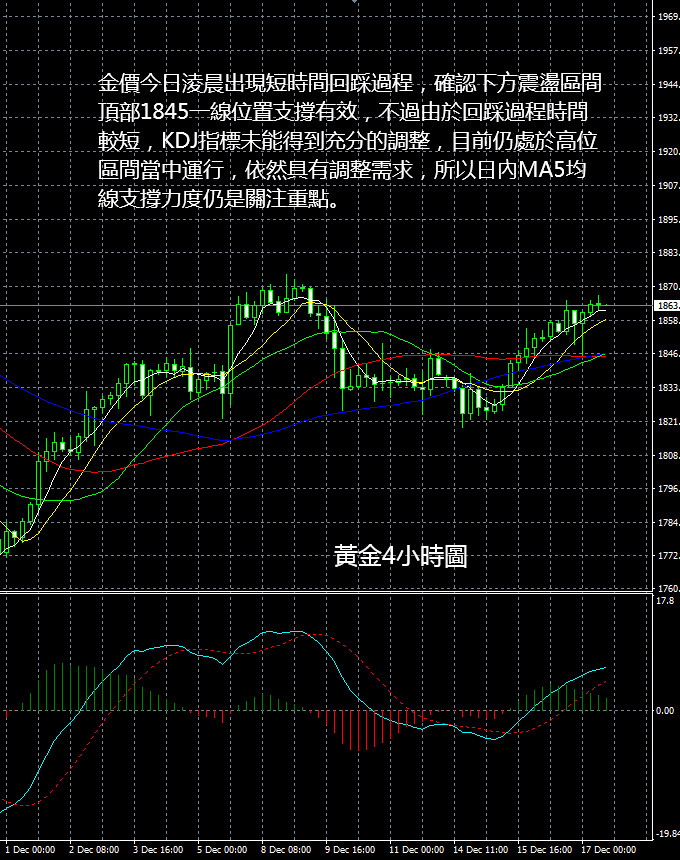 從現貨黃金4小時圖看,金價今日淩晨出現短時間回踩過程,確認下方震盪區間頂部1845一線位置支撐有效,不過由於回踩過程時間較短,KDJ指標未能得到充分的調整,目前仍處於高位區間當中運行,依然具有調整需求,所以日內MA5均線支撐力度仍是關注重點。