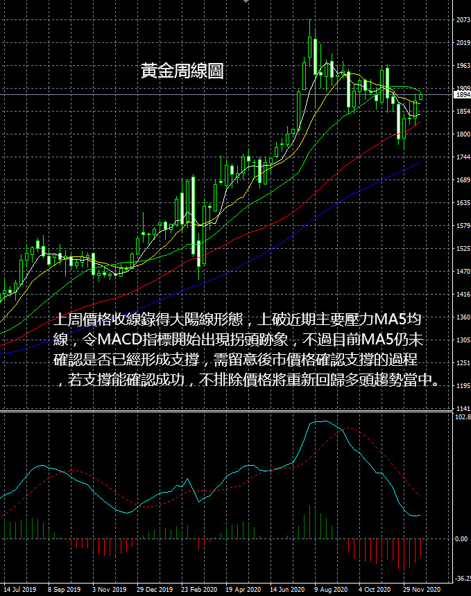 從現貨黃金周線圖看,上周價格收線錄得大陽線形態,上破近期主要壓力MA5均線,令MACD指標開始出現拐頭跡象,不過目前MA5仍未確認是否已經形成支撐,需留意後市價格確認支撐的過程,若支撐能確認成功,不排除價格將重新回歸多頭趨勢當中。