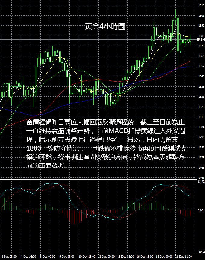 從現貨黃金4小時圖看,金價經過昨日高位大幅回落反彈過程後,截止至目前為止一直維持震盪調整走勢,目前MACD指標雙線進入死叉過程,暗示前方震盪上行過程已經告一段落,日內需留意1880一線防守情況,一旦跌破不排除後市再度回踩測試支撐的可能,後市關注區間突破的方向,將成為本周趨勢方向的重要參考。