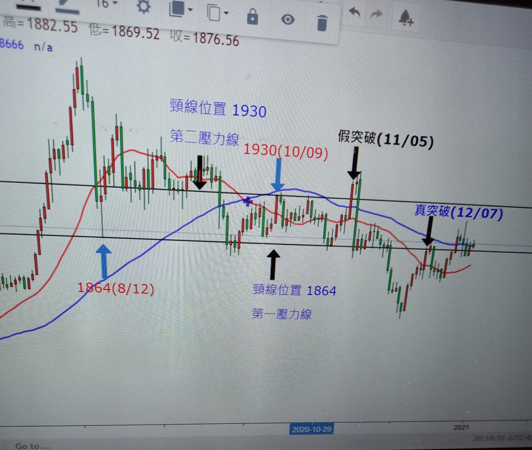 ***一旦真突破1864後,20日均線價上升至1864時,價應該是已經站上120日均線,如果價站上120日均線後,這意味著1930很快就突破了,因為1930是預測出來的也是假突破點,所以1930不是真正的壓力,而上面的山頭也不是壓力,而是1864才是真正(多空分水嶺)的關鍵點。(經驗)***