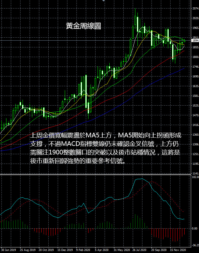 從現貨黃金周線圖看,上周金價寬幅震盪於MA5上方,MA5開始向上拐頭形成支撐,不過MACD指標雙線仍未確認金叉信號,上方仍需關注1900整數關口的突破以及後市站穩情況,這將是後市重新回歸強勢的重要參考信號。