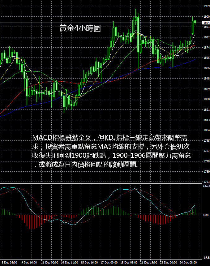 從現貨黃金4小時圖看,MACD指標雖然金叉,但KDJ指標三線走高帶來調整需求,投資者需重點留意MA5均線的支撐,另外金價初次收復失地回到1900起跌點,1900-1906區間壓力需留意,或將成為日內價格回調的啟動區間。