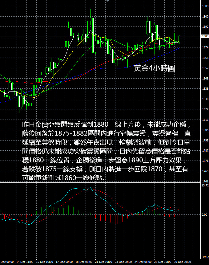 從現貨黃金4小時圖看,昨日金價亞盤開盤反彈到1880一線上方後,未能成功企穩,隨後回落於1875-1882區間內進行窄幅震盪,震盪過程一直延續至美盤時段,雖然午夜出現一輪劇烈波動,但到今日早間價格仍未能成功突破震盪區間,日內先留意價格是否能站穩1880一線位置,企穩後進一步留意1890上方壓力效果,若跌破1875一線支撐,則日內將進一步回踩1870,甚至有可能重新測試1860一線低點。
