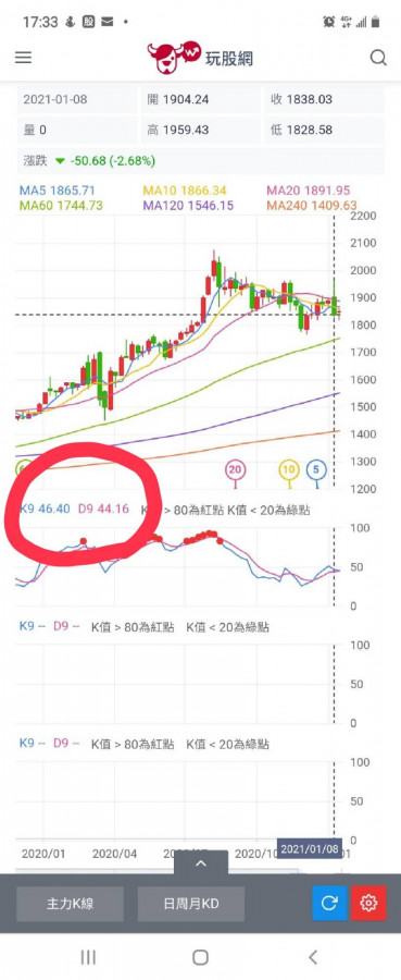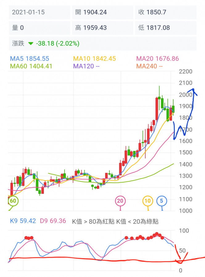 月線最大危險之處,不是5/10月均線交叉( 即使交叉也很容易扭轉),最大危險就是20月均線上升的速度已經快接近K線,也就是20月均線一旦接近5/10月均線,那後果……你回頭去看看歷史高點1920那個狀況,你就明白無心在說什麼了!