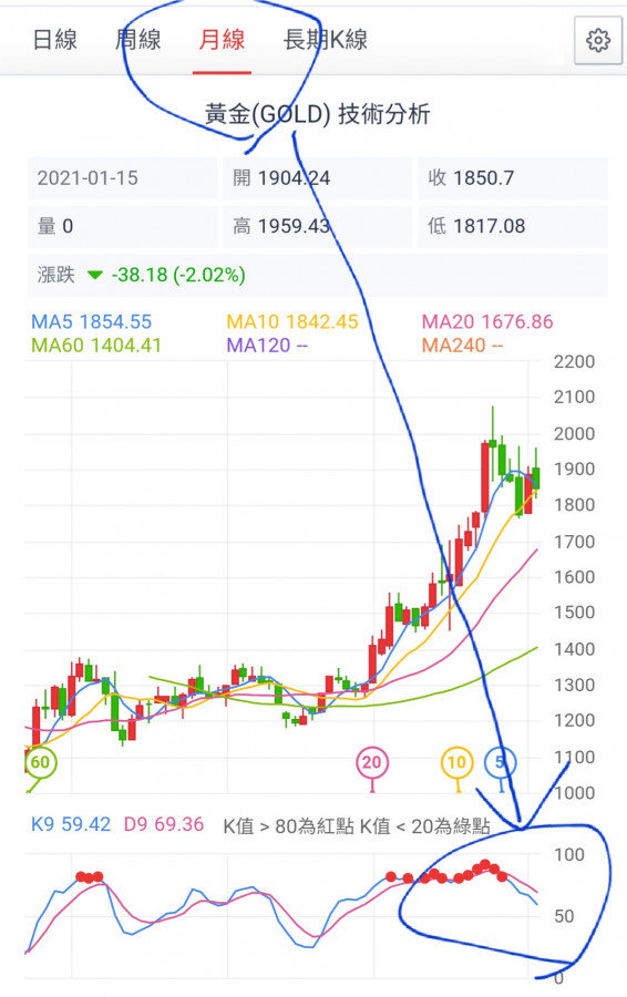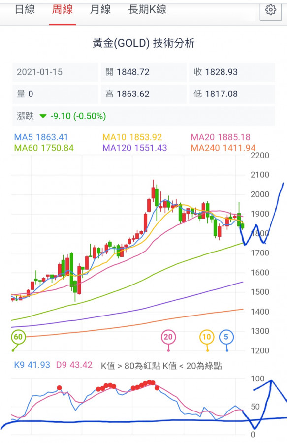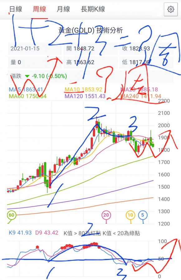 將月線下降線圖套用在週線圖上,(久盤必跌,盤久成頭),無心說過這次的下跌修正主角是(月線),通常月線從(8月2073)高點下跌到低點(11月1764)滿足後至少3個月,低點滿足後再整理至少也有3個月(12/01/02月)打底,所以共計有六個月(09/10/11/12/01/02月)時間成V型反轉,這是按照技術分析來研判(KD指標應該是落在50之上)!!!所以2021/02月應該是要發動強勢上漲的攻勢,如果金價還在拖泥帶水的話,這就該小心謹慎了(KD指標破50下危險)。
