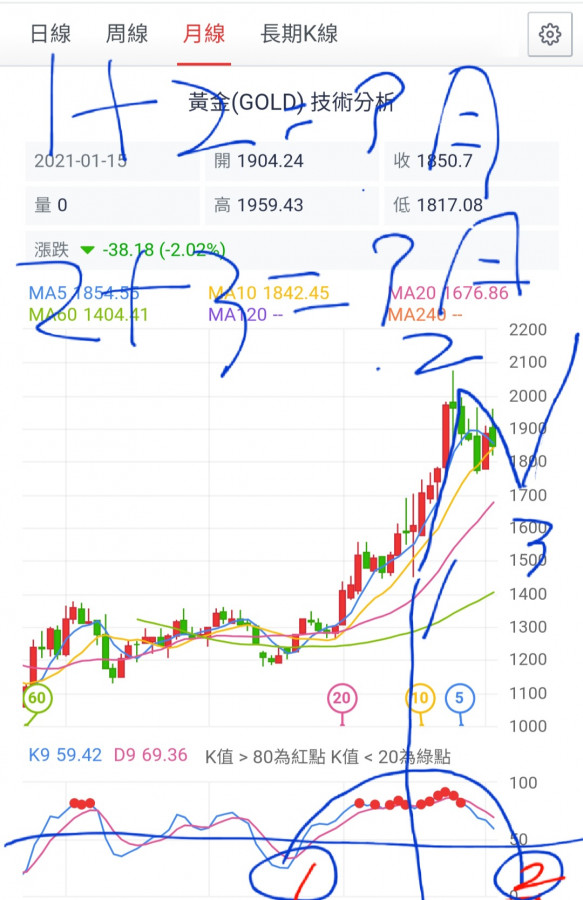 經濟面是支撐金價,地緣政治是助漲金價,無心說1/20之後會再重新考慮目標是否該有異動!?如果2021只靠經濟疫情支撐金價,這應該是金價在盤頭的動作。從目前美國拜川權力交接來看,川普是否還有能力將國內矛盾問題轉移國內分裂或國外……,如果一切都順利交替完成,那麼2021應該是烽火太平的開始,……。一旦天下太平那麼……只靠經濟問題……那金價的高點是有限的!