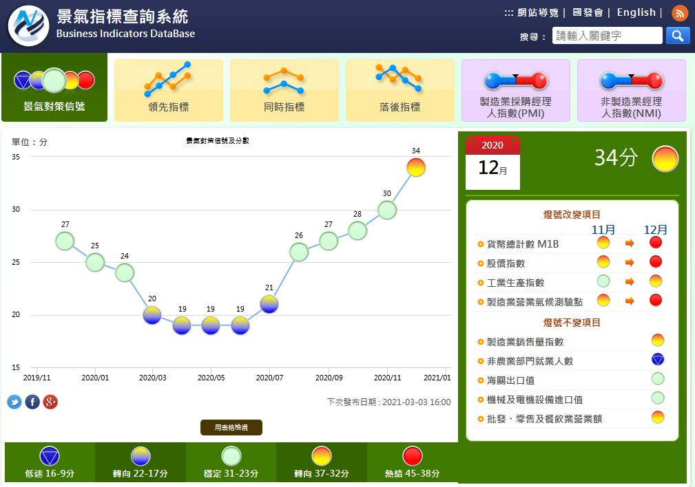 109年12月景氣對策信號綜合判斷分數為34分,較上月增加4分,燈號轉呈黃紅燈;景氣領先、同時指標持續上升,反映國內經濟增溫。