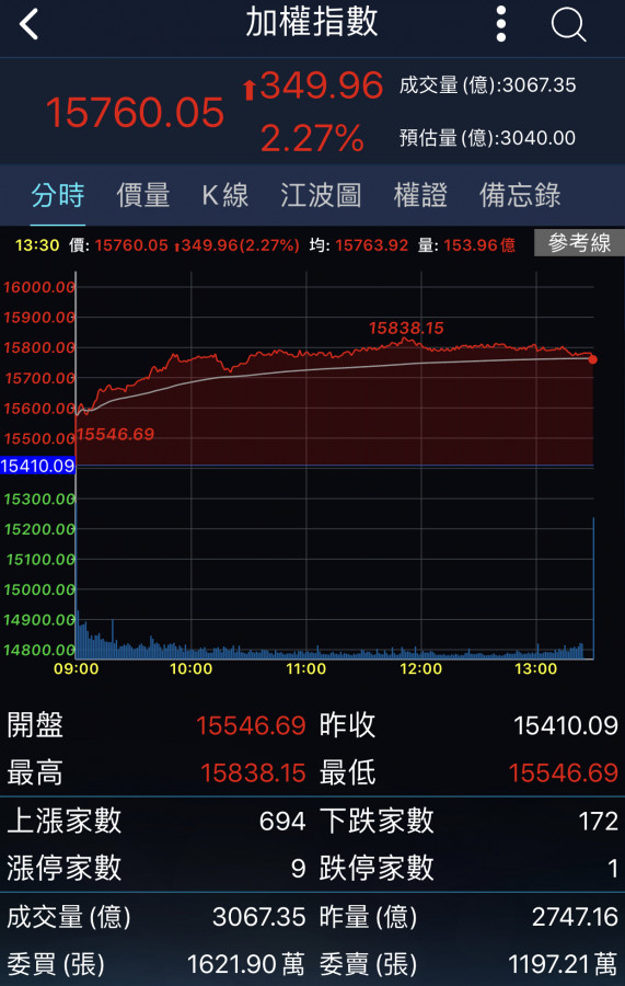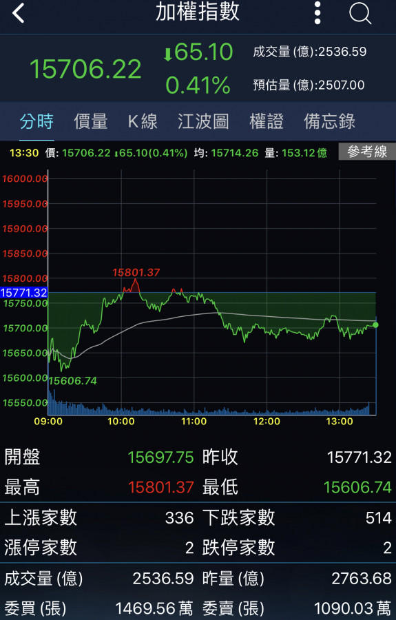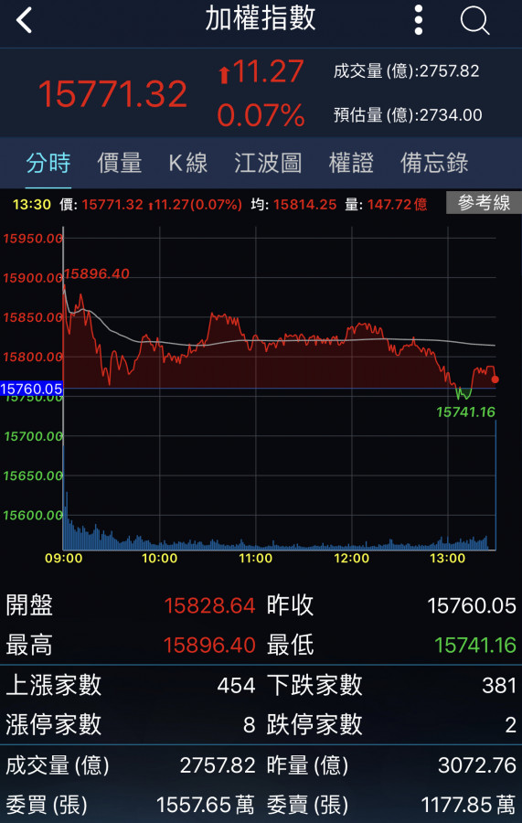 台股今(3)日早盤持續在電子股表現強勢下,大盤連續三天出現跌深反彈,不過由於短線反彈已逾700點之上,加上整體量能無法跟上,短線賣壓出現,指數漲幅收斂,終場加權指數上漲11點,收在15,771點。