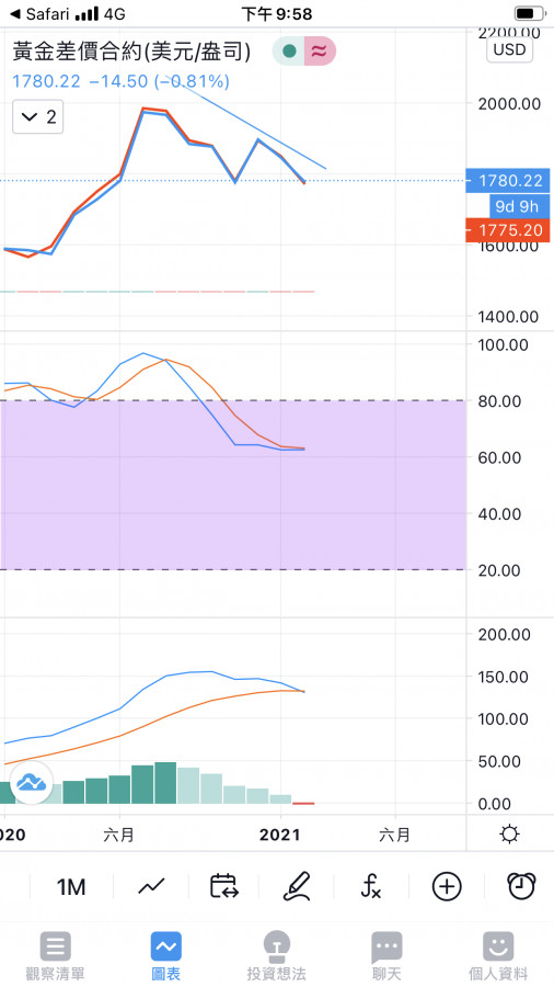 注意自2020/08見高2073點後,金價一直在2020/07長紅K線上下盤整修正,而此月線修正目標主要針對的是KD指標次為價位,若以目前20月均線上升的20(1694)速度對應1764,大概需要4個月(3=1714/ 4=1734/ 5=1754 / 6=1774)時間到達1764,以這樣的盤勢盤整用意是等待KD指標落底。(操盤手是否會如此作法……呢?)