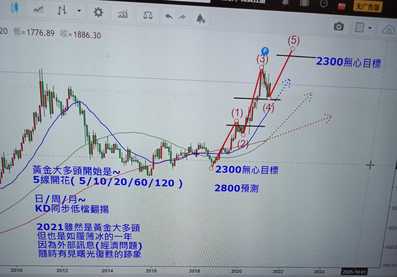 無心曾說,黃金真正的大多頭形成的模式是【月/週/日線(5/10/20/60/120均線,三圖的五條均線趨勢都必須一致上升)】。