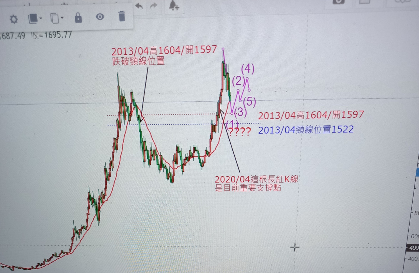 (1)紅色虛線是第一道防守線配合2020/04最重要這根長紅K線。