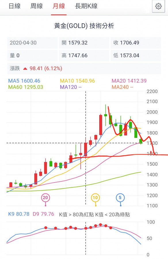 2020/4、5、6、7月這四個月的漲幅非常大,原因就是(地緣政治伊朗導彈、台海危機)所創造出來的漲幅,所以月線早該進行回測的動作卻因意外的(地緣政治)……,所以現在的月線回測整理只是將這四個月的意外漲幅調整回歸正常態,一旦調整完金價才會走屬於實質的(經濟問題),而會走到那裡呢?……無心先暫且看1920。