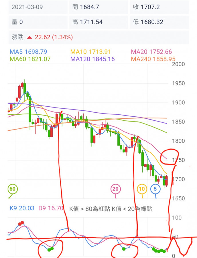 主要還是觀察月線主力KD指標何時(打平)(翻揚)(K穿過D),這三個步驟完成後就等于日線該出場的出場,週線就會該追空的空,月線就會一身輕的展開第一根的近百點紅K線,當你還沒回神,就會再拉出第二根百點紅K線,這兩根紅K漲勢就近二百點。