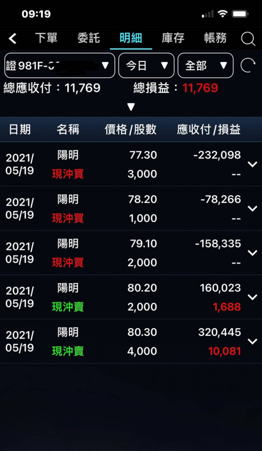 因為之前我曾買五張九暘,隔天小賺就全賣出,尾盤九暘漲停我發現錯賣又馬上買回,後來賺到四根漲停所以這次陽明賣了今天就立刻買回,我的做法是覺得自己錯賣就會考慮買回!