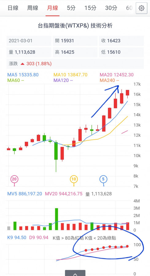 1/ K線離均線越遠,表示高點可期,強勢盤。
