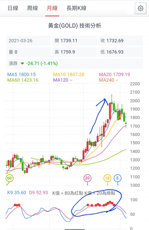 4/ 轉弱盤~(K線價跌破5月均線,站不穩5月均線,5月均線正式下彎下行,KD正式交叉下行,以上所述成立後……自行對照黃金月線圖就可知道該如何應對了!)