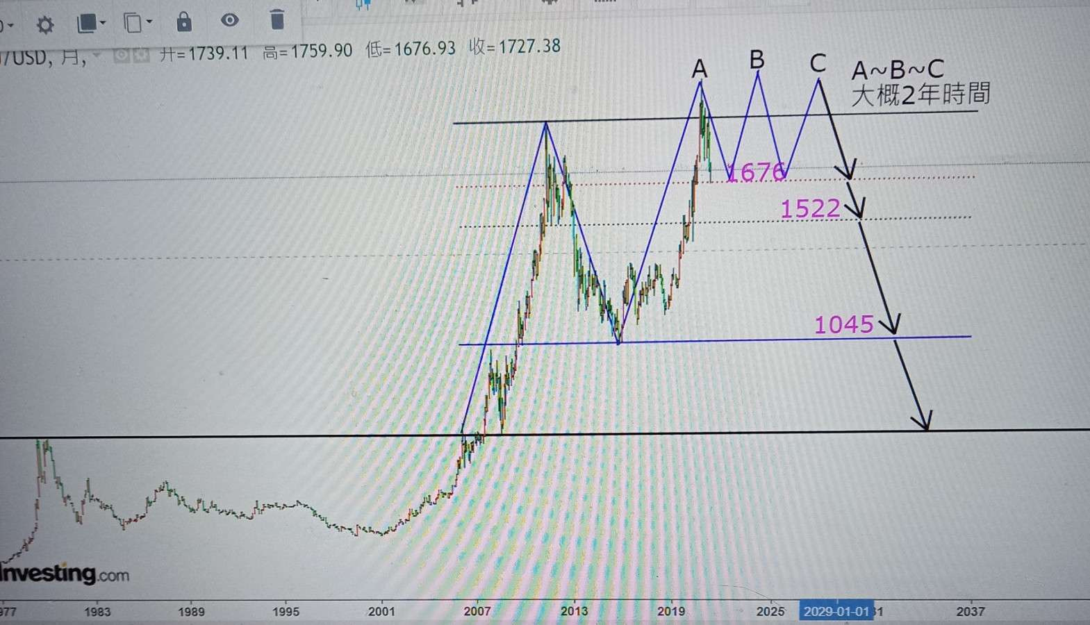 無心個人認為1676~(B點=2300???)這段漲幅內容應該是(通膨+股市+美元)所創造出來的!