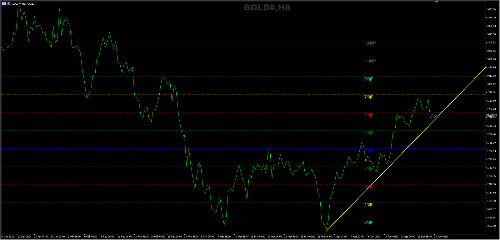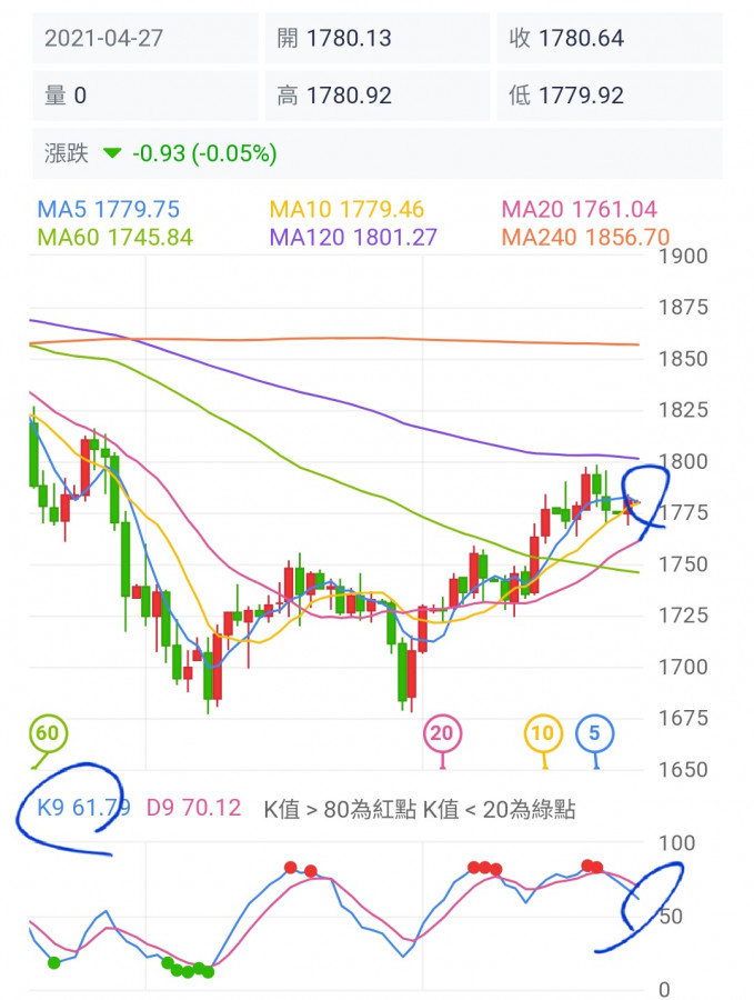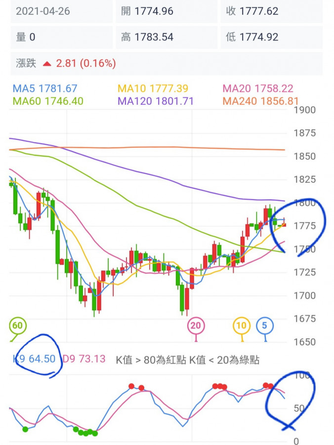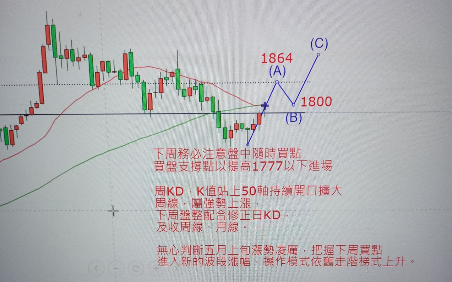 既然價有本事挑戰1764,那麼下一個目標就是1864,本週既將收月線,4月肯定是長紅K,5月上旬肯定是開平走高挑戰1864,那你就注意看月KD的變化及5月均線已打平反彈(已有領先月KD,這個現象無心有空再解說,關係到未來的動向)。