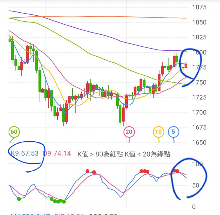 回覆 無心:圖( 1 )左右頭尖底。月KD,K值成V...