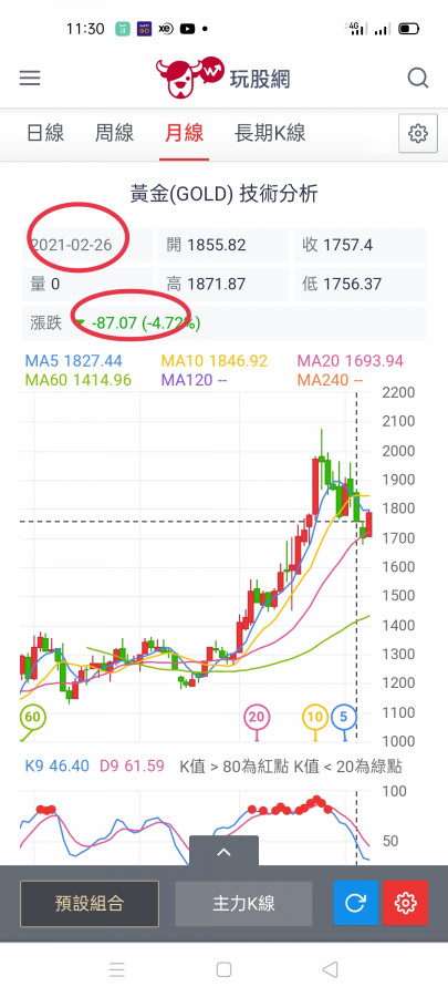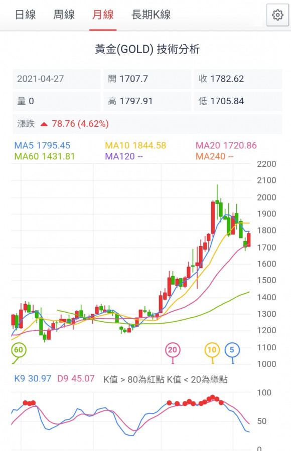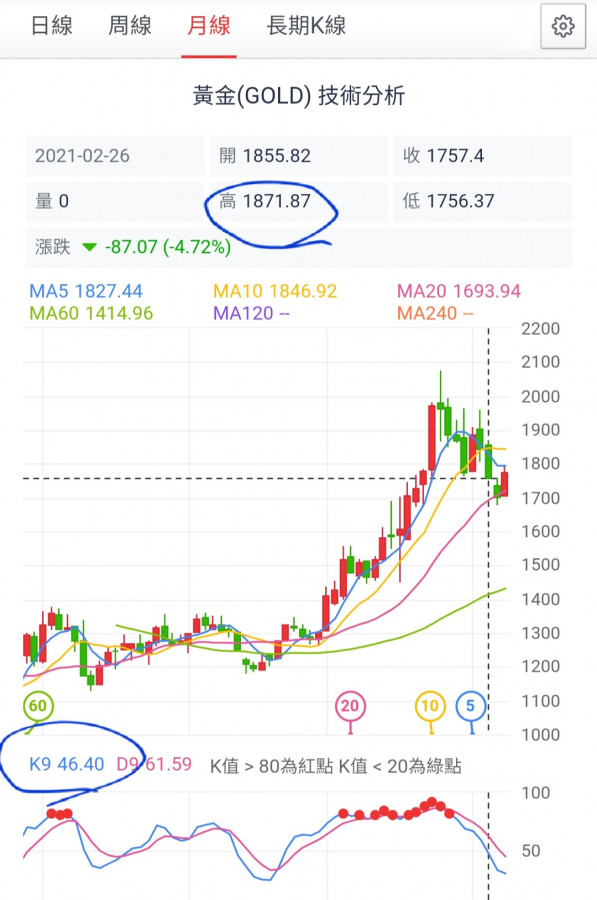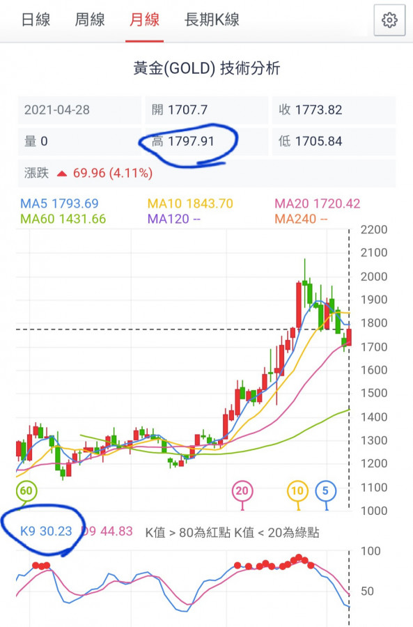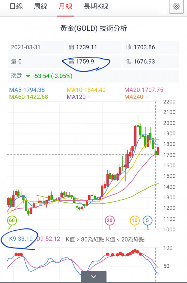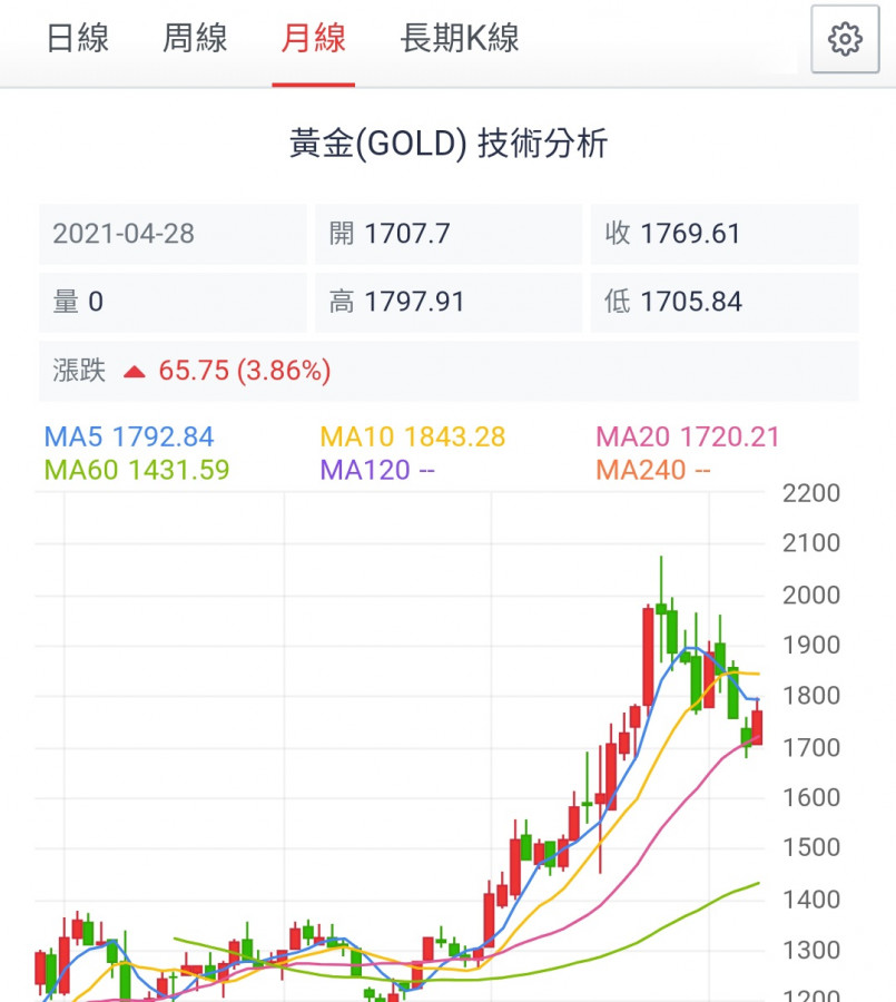 回覆 無心:這是黃金月線圖無心說過,黃金漲跌是反應股...