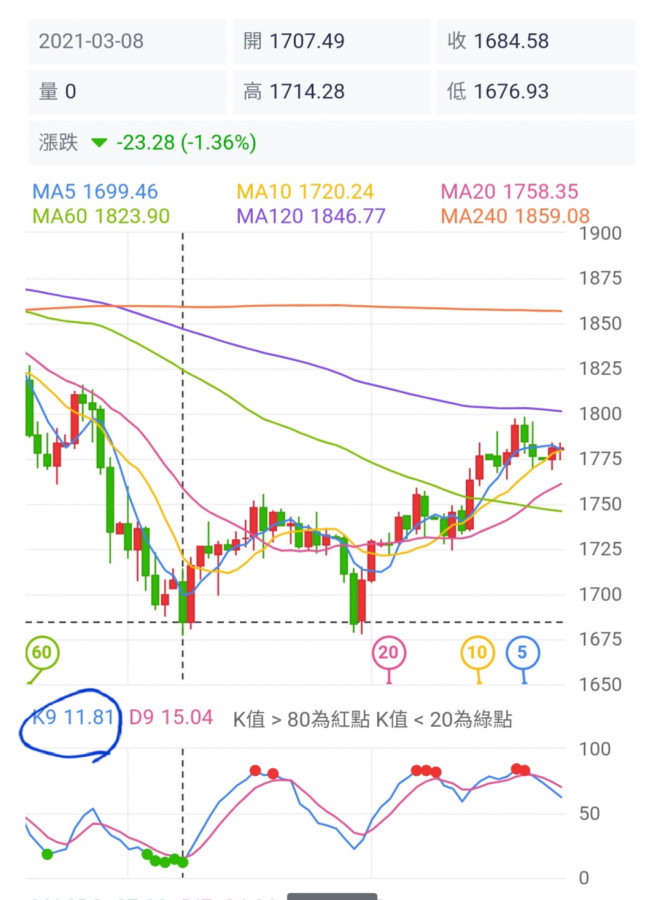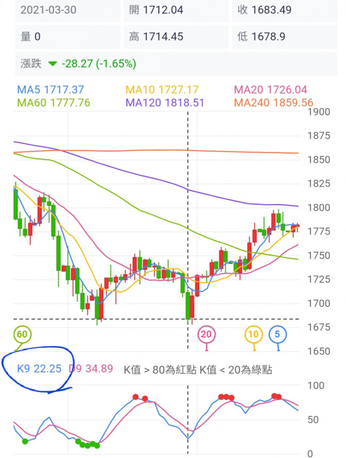 (1676雙腳打底)。月KD,K值打平(1676雙腳)。