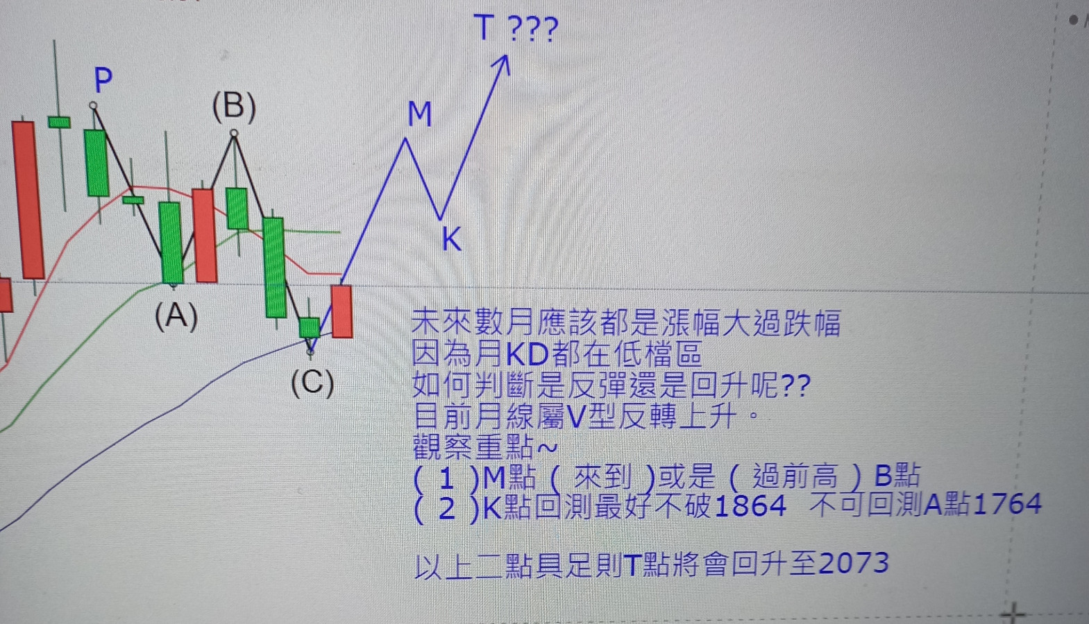 (走完下跌五波~ V 形反轉)。月KD,KD上下縮腳探底(走下跌五波1560千萬別跌破/1650???)。