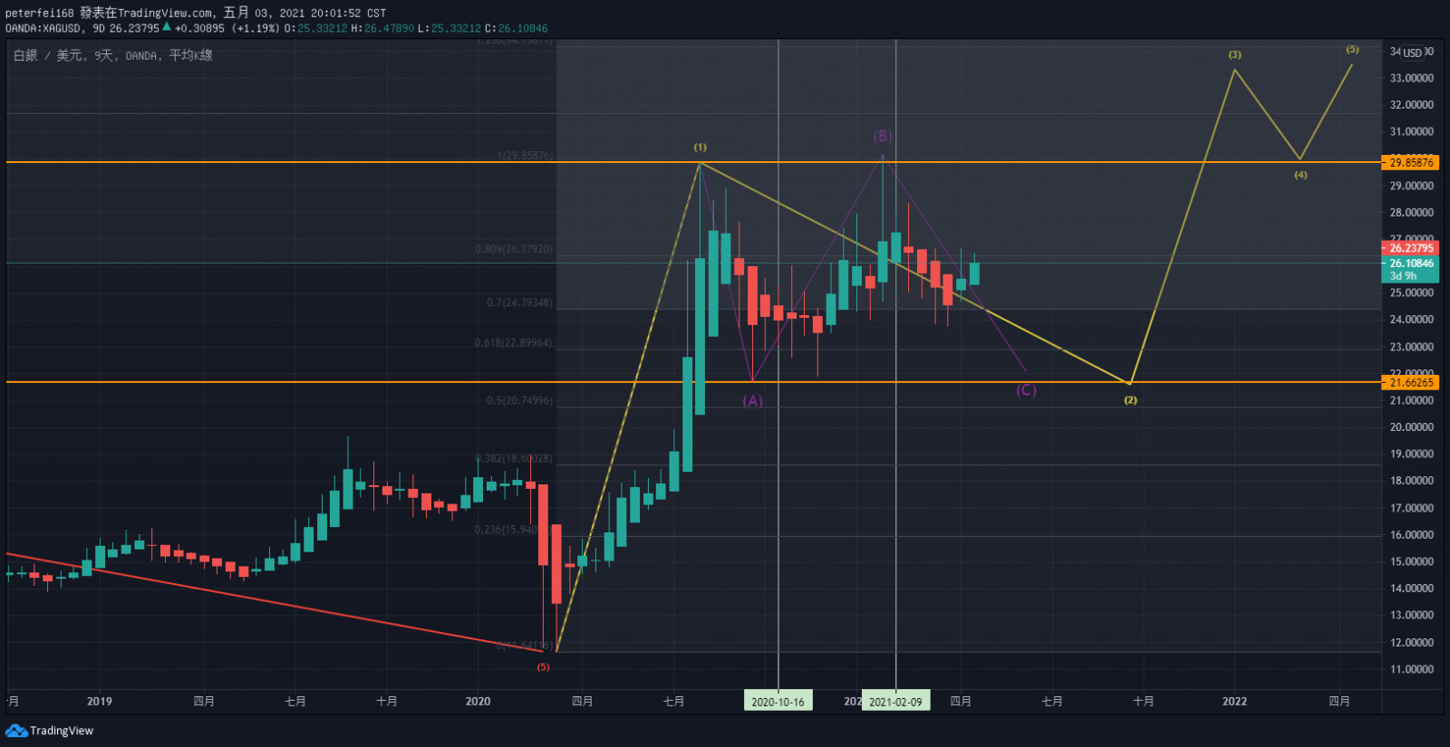 剛剛心血來潮,用白銀兄弟檔來分析(使用特殊9天週期),意外發現有可能近日內大幅回撤(黃金也很有可能同步)😒,但是長線依舊看多不變。