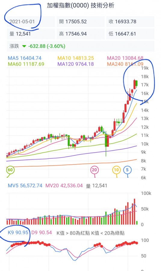 (240日均線~1864還是有相當壓力的套牢區,又配合日/週KD處於高檔,所以應該是會有一定較大的回檔修正)。