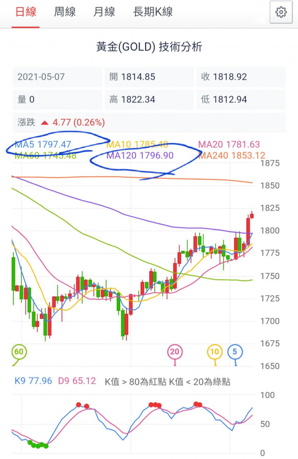 今日的高點有限(5/120日均線交叉的高點1822)。