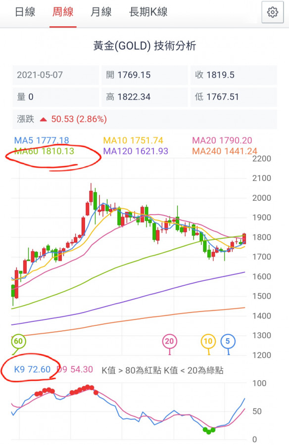 月線KD有翻揚但是尚未交叉,而且5月均線下跌中,是否會在五月底六月初跟隨月KD一起翻揚,這也是要非常注意看的看盤重點!