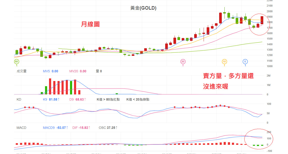 但是黃金在去年(2020/03、07月)間發生了二次意外就是地緣政治因素,所以讓黃金與股市有脫勾的現象,所以黃金見2075後就開始拉回將近8個月。