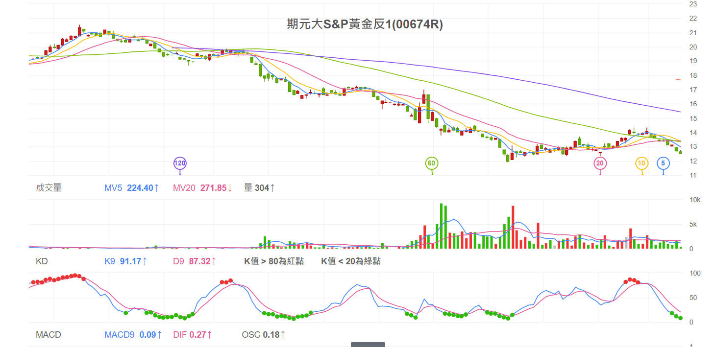 這是一張【元大S&P黃金反1(00674R) 】的周線圖