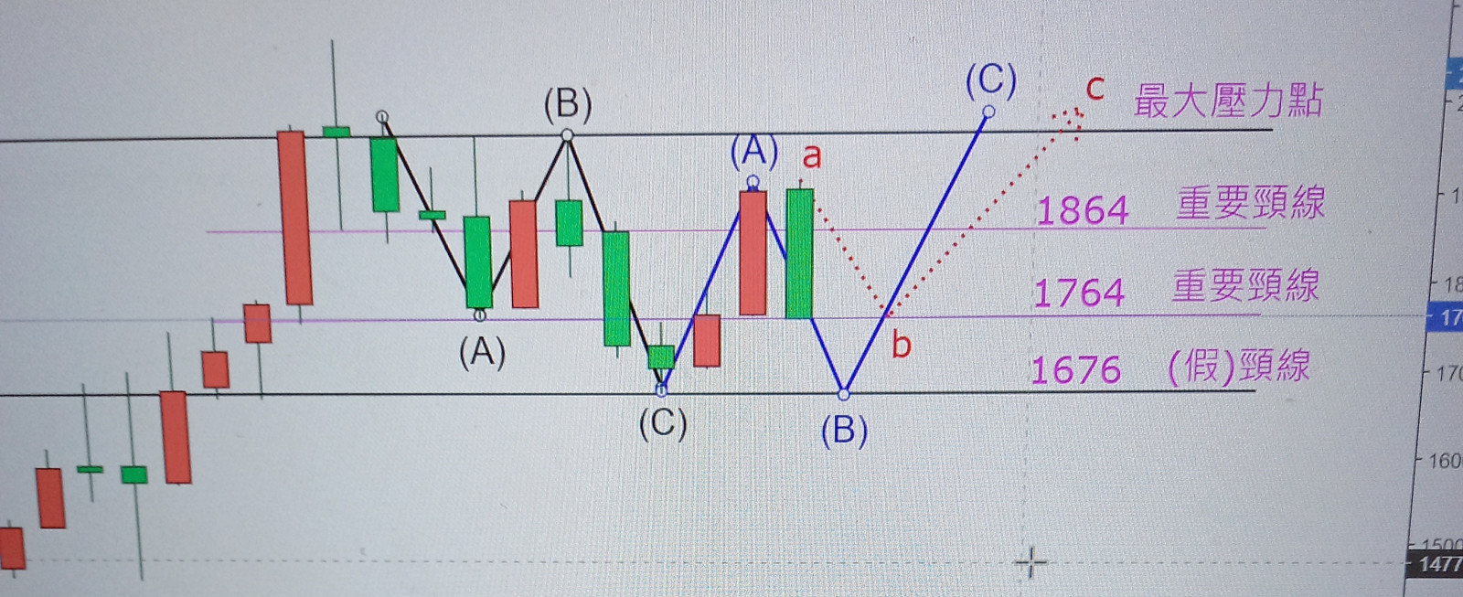 下週如果沒有跌破20月均線,就會進行(a~b~c)左右頭尖底。
