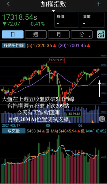 大盤在上週五收盤跌破5日均線,台指期週五夜盤下跌209點,大盤今天開低機會較大,受到美股下跌的影響,今天有可能會回測月線(20MA)位置測試支撐。