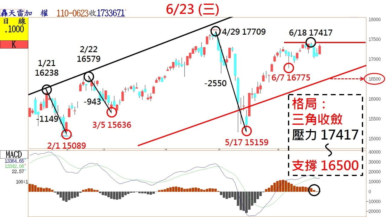 今天台股突破並且站上17305,化解MACD柱狀體轉為負值的疑慮,開盤時指數在17305以下,同時見到MACD柱狀體開始在負值跳動,但因尾盤指數拉高站上17305使的柱狀體仍能維持正值,不過柱狀體現階段仍處於收歛狀態,因此未來2天仍需留意MACD柱狀體的指標變化