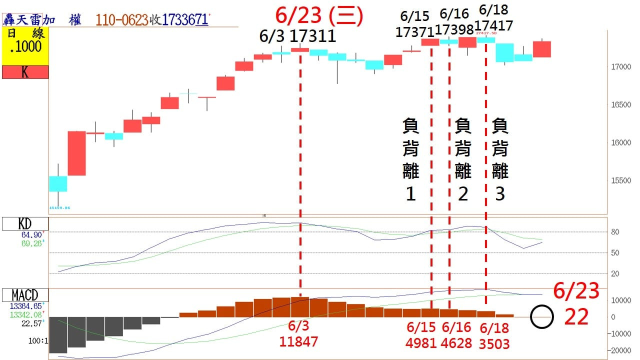 20210623指數就是右肩整理,日KD指標交叉向下短線轉弱,卻是你中長線的機會,因為月季線黃金交叉,這兩天的下跌都有來到季線,都是中線佈局的好時機。有人問我說如果這一次在過前高要不要有量?KD要不要過高?當然還是要,過高不能雙背離。