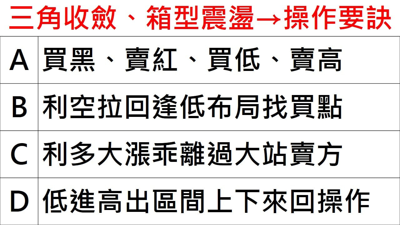 在台股上漲的格局中,個股表現漲跌不一輪動速度快,因此這個階段提醒大家箱型格局中的操作要訣:A.買黑、賣紅、買低、賣高,B.利空拉回逢低佈局找買點,C.利多大漲乖離過大站賣方,D.低進高出區間來回操作,舉例來說前天華邦電低點32.3元在箱型格局的相對低檔,今天衝高來到箱型格局的相對高檔36.3元,每檔股票都有自己的屬性結構,提前規劃運用型態位階低買高賣獲利