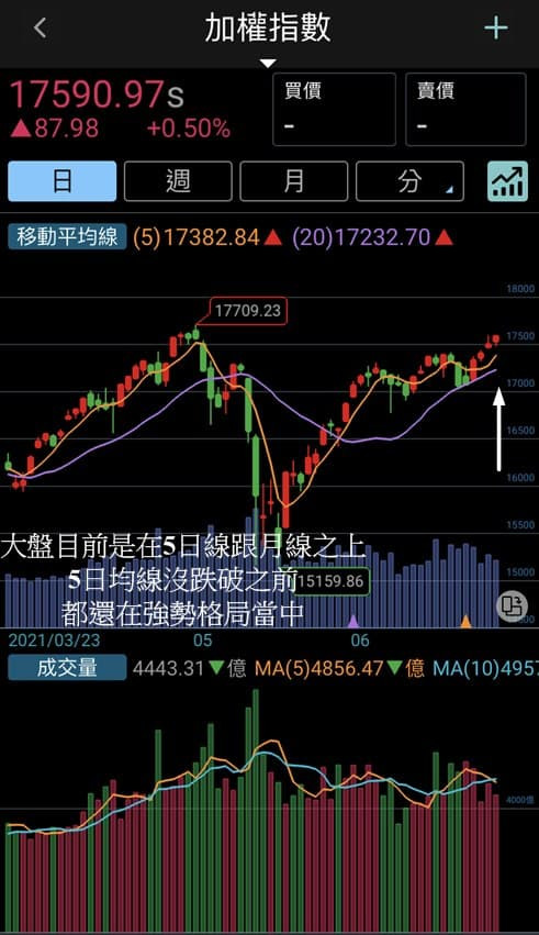大盤目前是在5日線跟月線之上,5日均線沒跌破之前,都還在強勢格局當中。