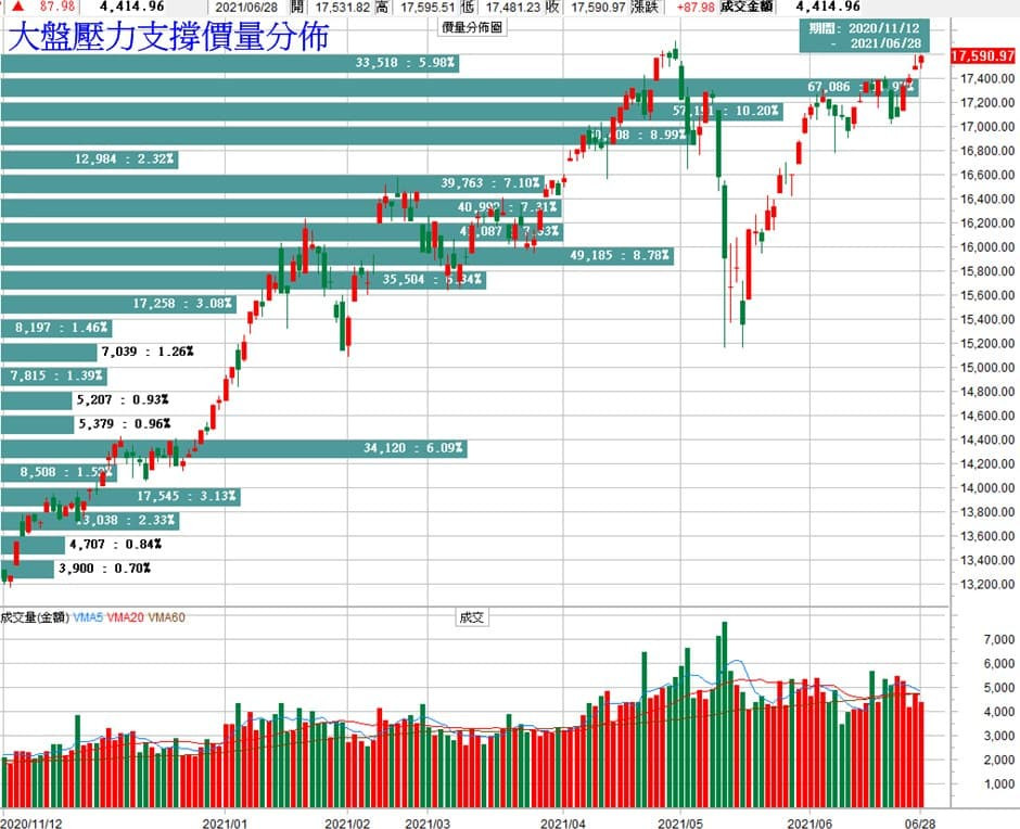 大盤近期走勢連四紅,接下來準備挑戰今年4/29號的高點17709點,後續上攻成交量能如果能放大到5000億元之上,就比較有機會突破前波高點。