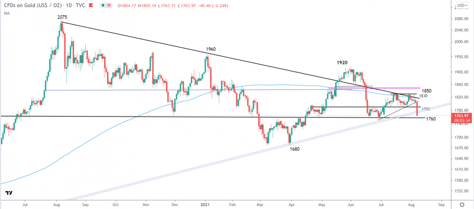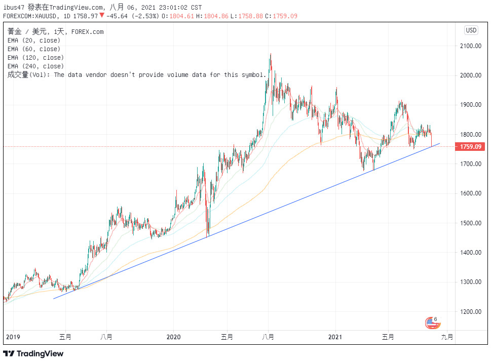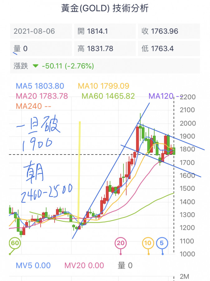 目前黃金已經如第一張圖表,跌破了2019年以來的上升趨勢,前幾次的反彈都無法爬上2075一線的壓力線。