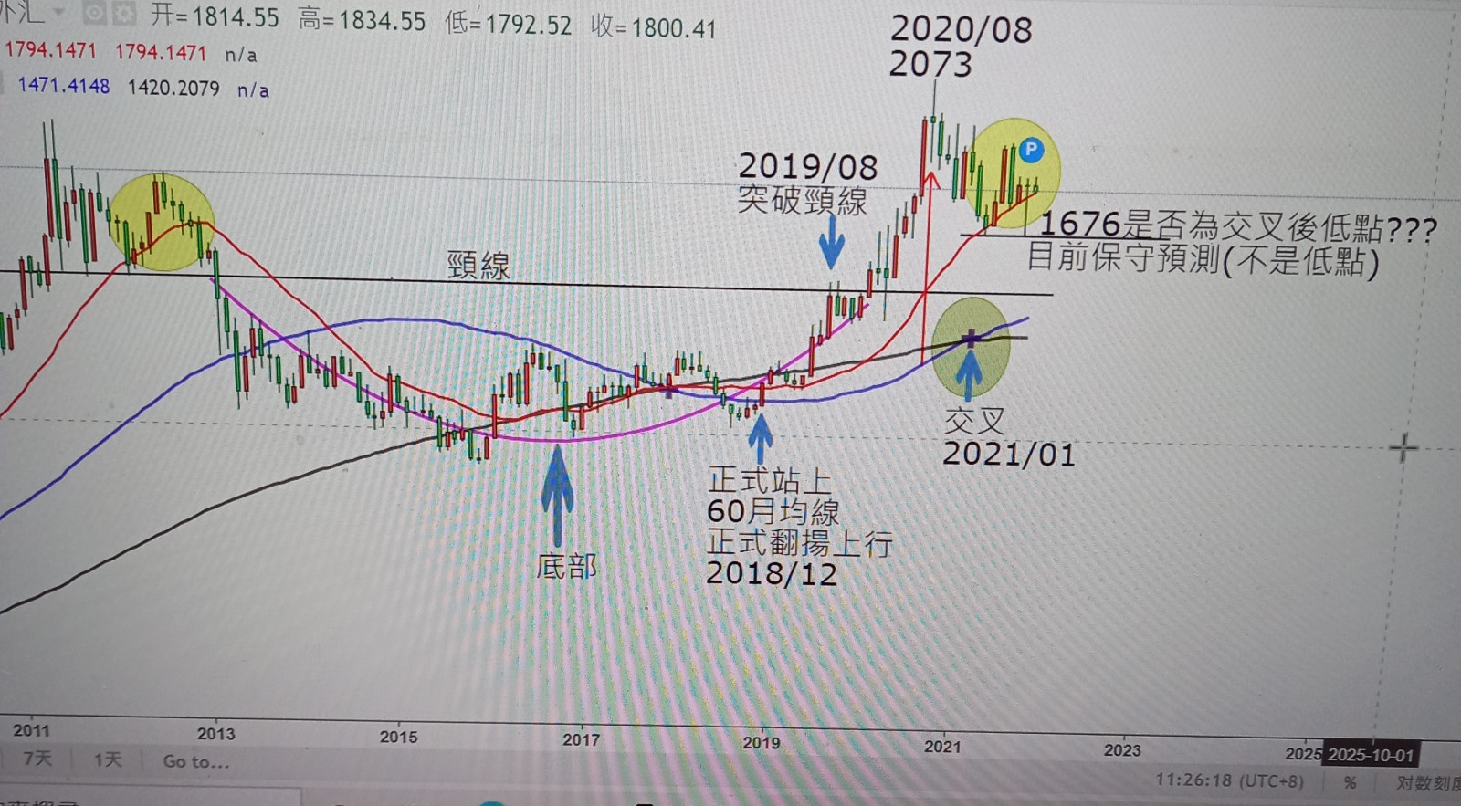 慣性上底部上來的高點判斷通常是看60/120月均線二者的交叉時間來預測高點的高度,(時間=空間)時間指的是(日數,週數,月數)月線就是指月數,空間就是指(價位)。
