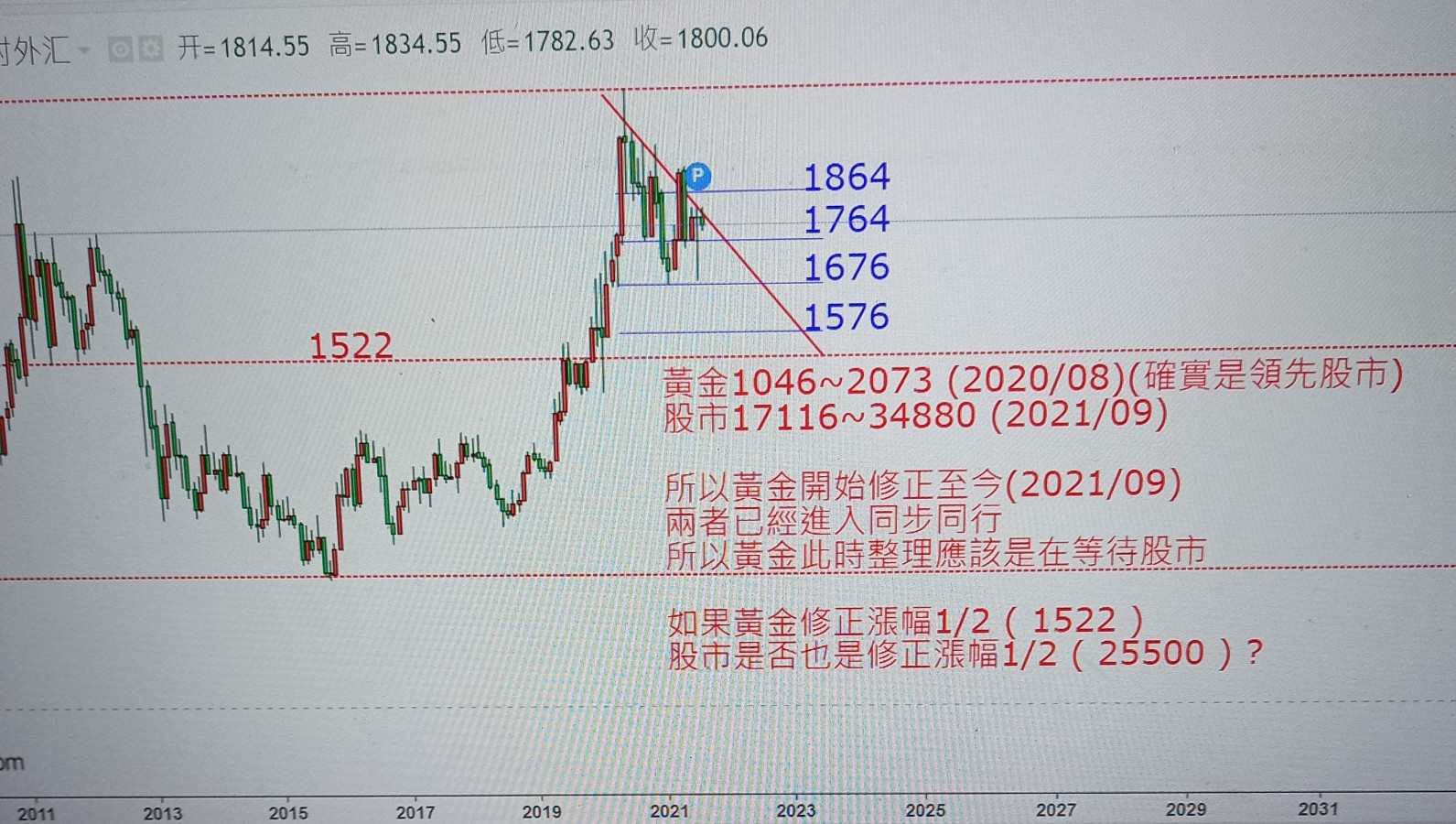 黃金與股市二者都以漲幅來修正1/2,注意看不管是時間、空間落點都剛好在2020/03這個位置點。