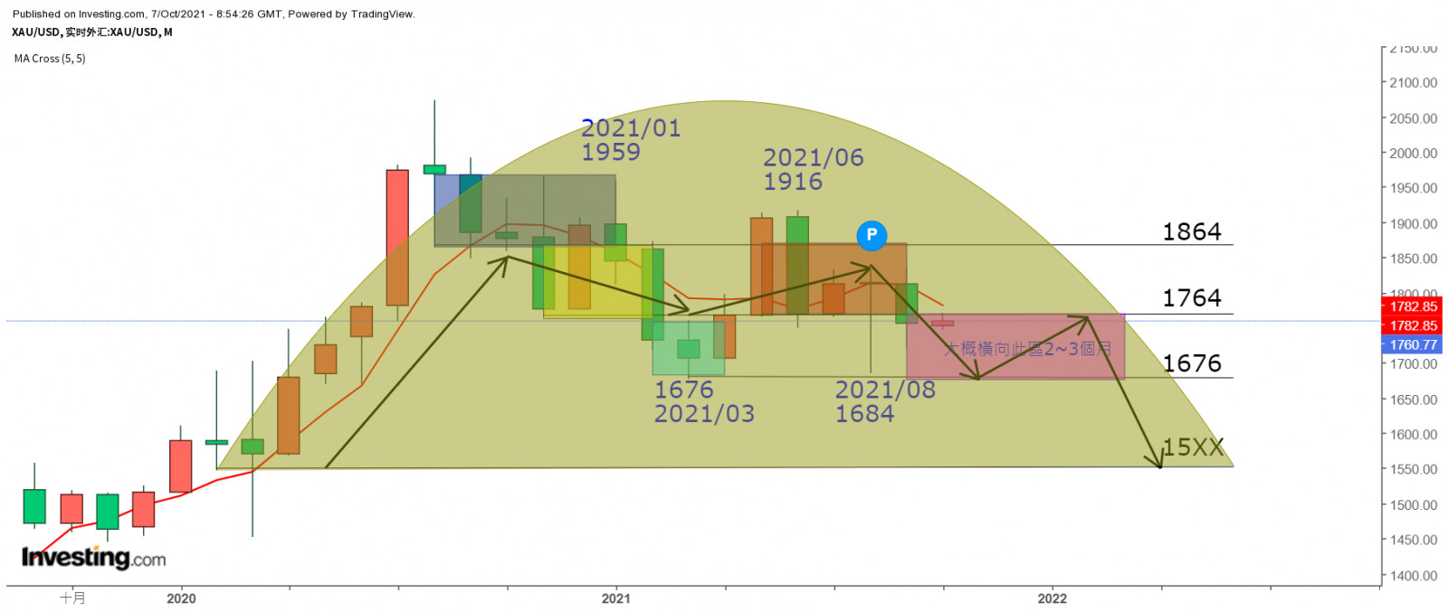 當它頭部完成及打底的同時股市也差不多落底盤整,不同的是股市打底的時間會比黃金短。