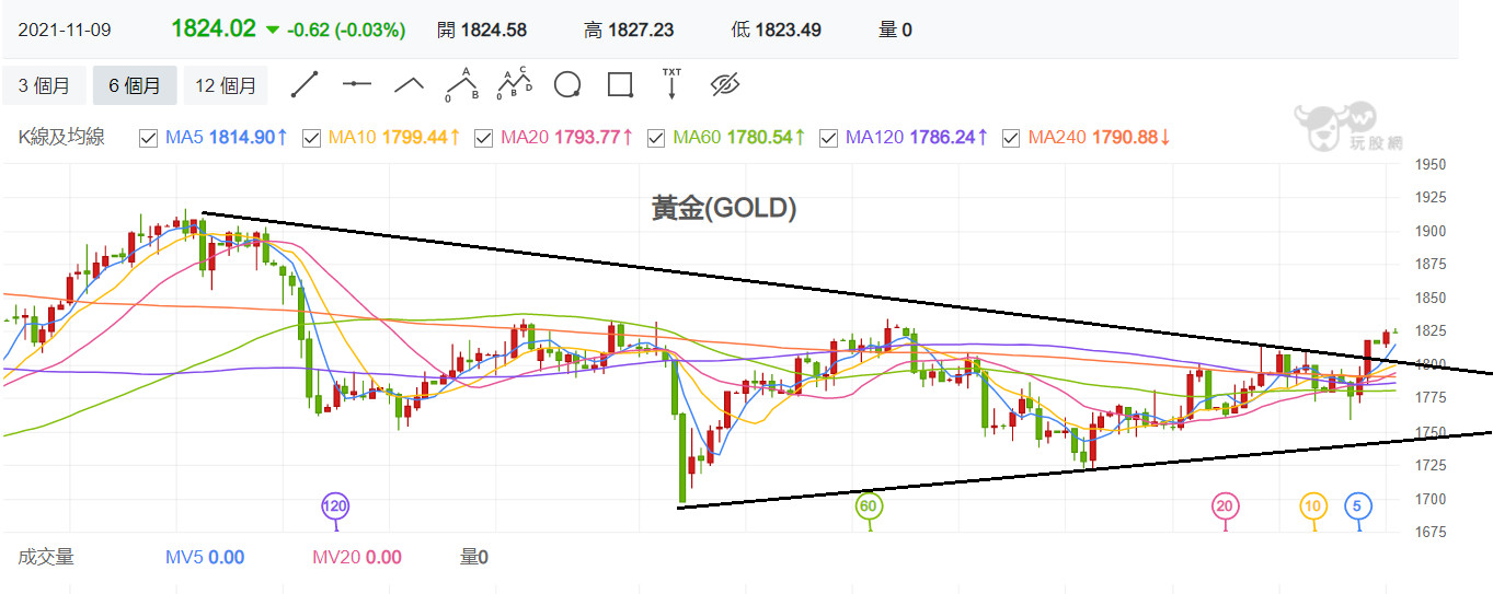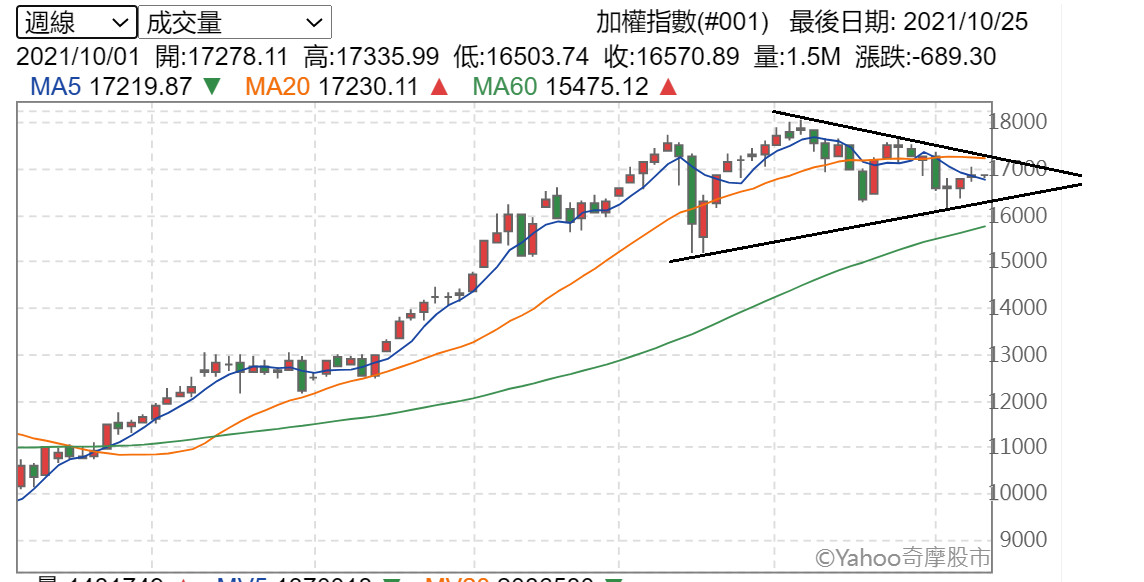 如下圖週線,台股正在旗型收斂三角區域遊走,下個月會往上突破旗型或往下跳水呢? 我猜是往上的機會大一些,理由如下:
