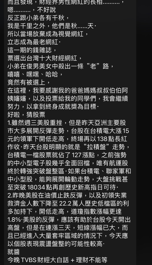回覆 嗨爪主席:昨晚美股四大指數收紅有強彈,有平盤…總之...