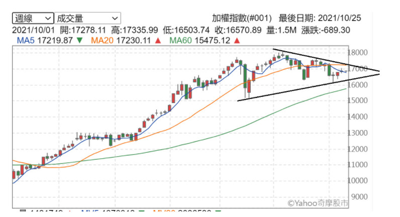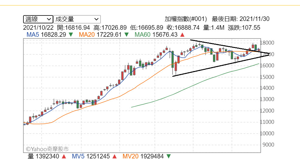 在10月底的時候,大盤周K線圖是長這樣(如上圖),那時候我猜11月大盤會往上突破下降壓力線,是個盤整向上的格局。今天是11月底了,大盤周K線圖是長這樣(如下圖),哈哈,還好沒漏氣,算是有猜到了,(猜指數區間則是差了幾十點)。