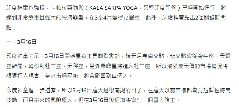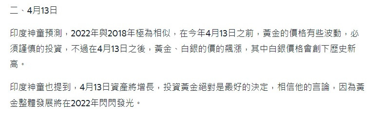 阿南德也點出「3月16日」和「4月13日」這2個時間點。其中3月16日那天會出現特殊的星象,屆時恐讓世界產生巨大改變,但並無絕對的好壞,有可能會讓市場平衡;而4月13日那天黃金與白銀有可能大漲,甚至可能創下史上新高。